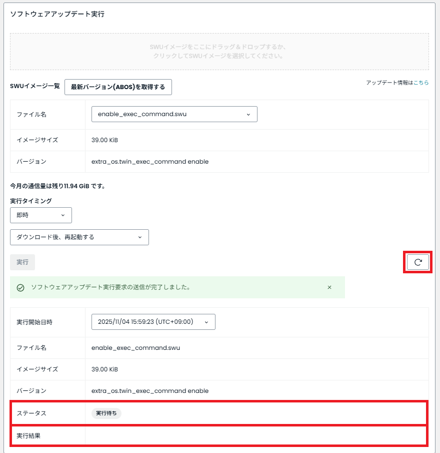 - ステータスが成功になると、インストール完了です。実行結果にアップデート後のバージョンが表示されますので、「extra_os.twin_exec_command」が「enable」になっていることを確認してください