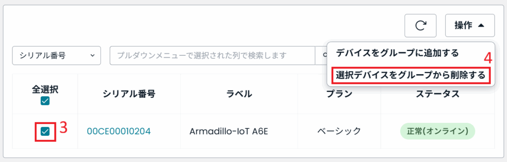 - 「操作」をクリックして、「選択デバイスをグループから削除する」を選択します