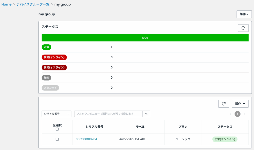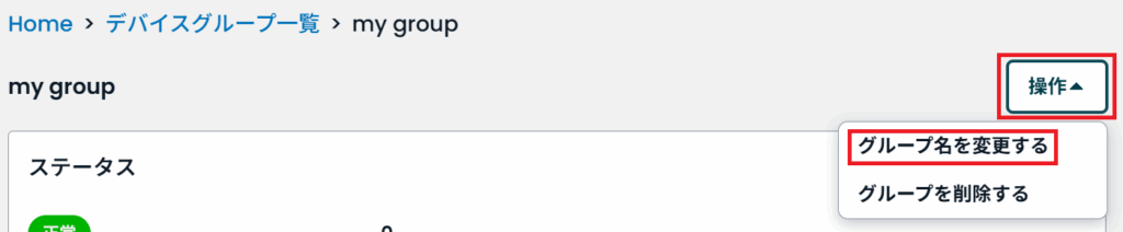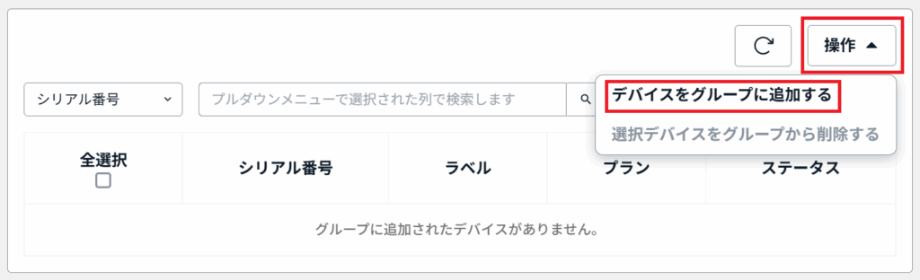 - グループの詳細画面内のステータスの下にあるブロックの「操作」をクリックして、「デバイスをグループに追加する」を選択します
