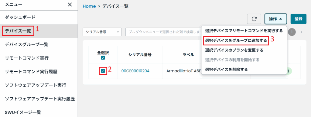 - 「操作」をクリックして、「選択デバイスをグループに追加する」を選択します