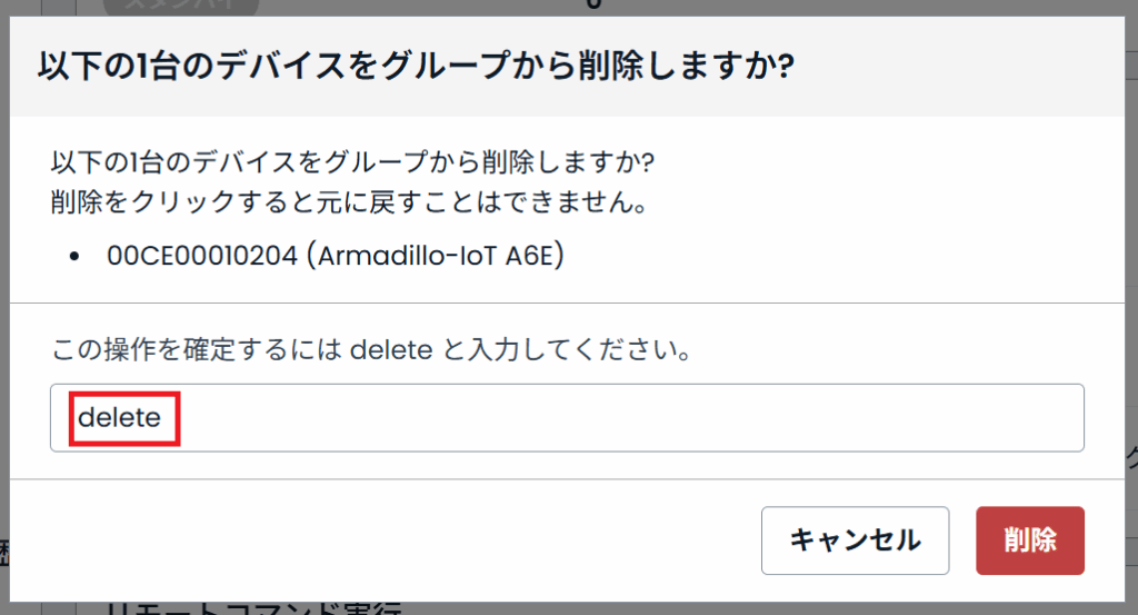 - 削除するデバイスグループを確認してから、「delete」と入力して削除します。成功するとメッセージが表示されます