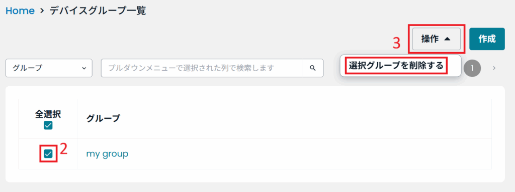 - 「操作」をクリックして、「選択グループを削除する」を選択します