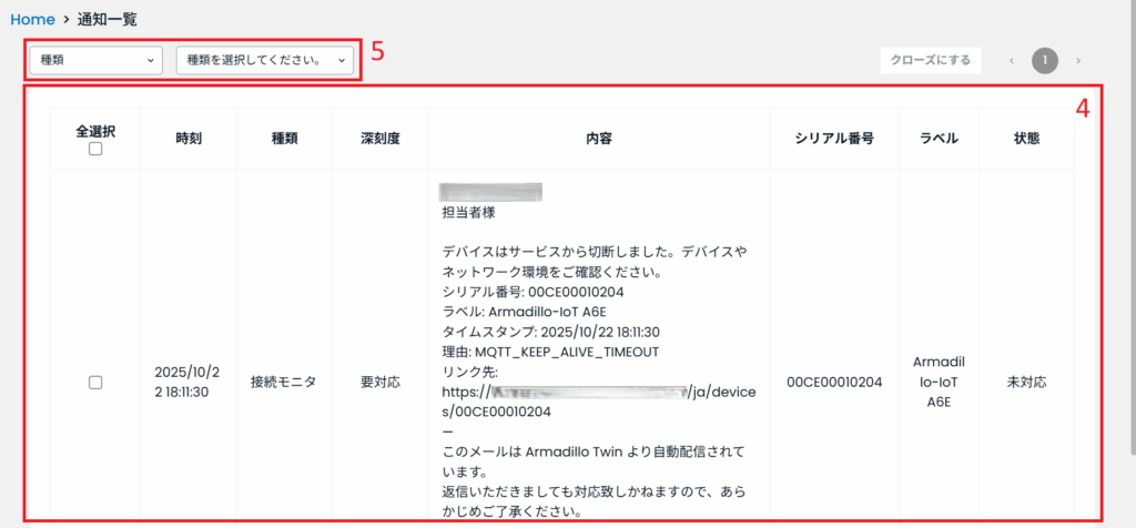 アラートは通知メールの他、Armadillo Twin 上の通知情報からも確認することができます