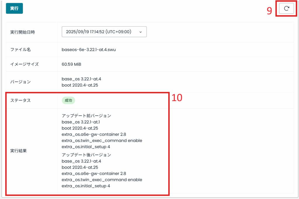 - Base OS のアップデートに成功すると、ステータスが成功になります。また、実行結果にアップデート前後のバージョンが表示されます